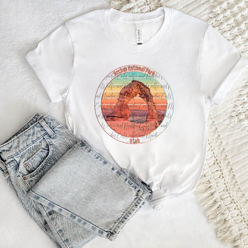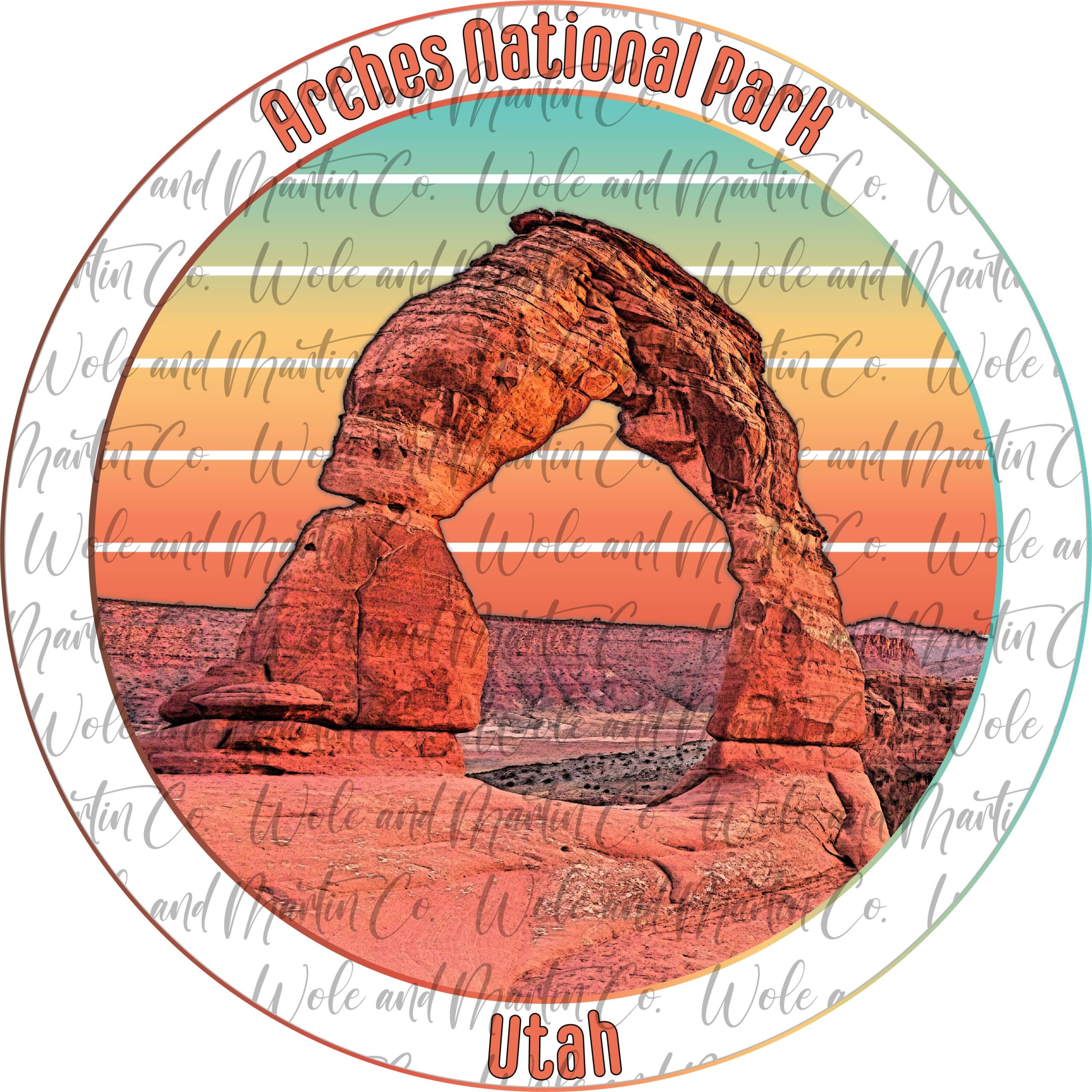 Show off the natural majesty of Arches National Park with this printable file. Featuring vivid oranges, reds and yellows against a retro-themed background, this southwest-themed file captures the awe-inspiring natural landscape that you can expect during a visit to one of Utah's most well-known national parks. Available as a PNG, JPEG, and SVG file, it is versatile enough to be placed on stickers, t-shirts, totes, home decor, and whatever else you want to attach it to.